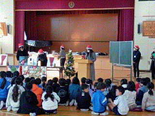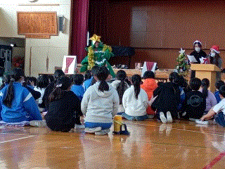 12月9日(火曜)ロング昼休みの時間に、クリスマスのお話し会が開かれました。保護者ボランティアの皆様が毎回趣向を凝らした読み聞かせをしてくださっています。今年はなんと大きな(動く!?)クリスマスツリーが会場に! 子どもたちは大喜び(^▽^)/ 保護者ボランティアの皆様、いつもありがとうございます。