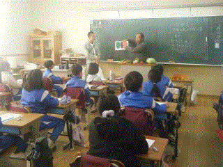 1月14日(水曜)午前中、1年・2年・3年・5年の各学級で栄養教諭さんによる授業を実施しました。1年生に向けては栄養教諭や給食センターの仕事について、2年に向けては栄養素のお話をわかりやすく。調理時に使用する、1年生の背丈と同じくらいのしゃもじも見せていただきました。3年生ではパプリカなどの野菜を栽培しているかたから、育てるときに気を付けていることなどをお話しいただきました。パプリカには7色もあることを聞いて、子どもたちもびっくり。5年生では農家のかたから有機農法で育てた野菜についてお話をうかがったり畑の肥料を実際にさわってみたり…。学習を終えた子どもたちは給食をより身近に感じ、「給食を残さずに食べたい」などの感想を発表していました。