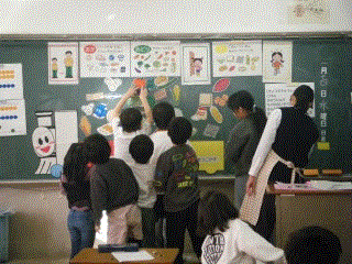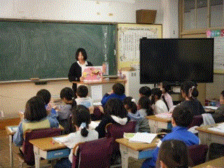 1年生の教室から「むかし、むかし…」という声が聞こえてきました。みんな紙芝居に集中しています。今日の国語の学習は、むかしばなしに親しむことのようです。先生の紙芝居が終わると、子どもたちはたくさんの絵本のなかから好きなむかしばなしを選んで熱心に読んでいました。