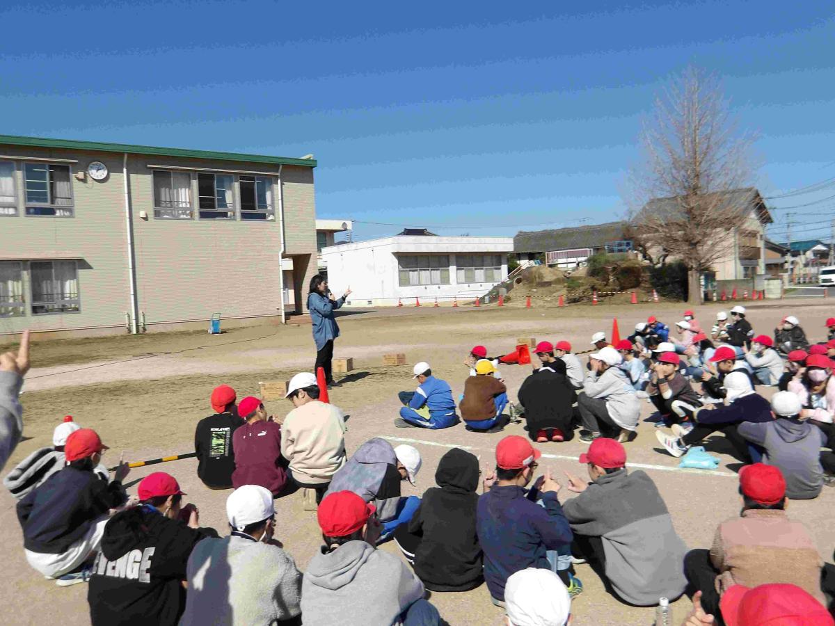 訓練後、5・6学年児童は校庭に出て、防災教室に参加しました。本日の防災教室は、桜学園コミュニティースクール協議会関連事業として開催しております。子どもたちは講師のかたから「防災に役立つサバイバル力」についてお話を聞いたり、危機を察知しやすいようにするためのエクササイズやゲームを体験したりしました。