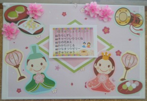 3月6日(金曜)の給食は「卒業お祝い献立」です。主食はお赤飯、サラダに、お花の形をしたハンバーグ。ケーキもそえられています(^^♪