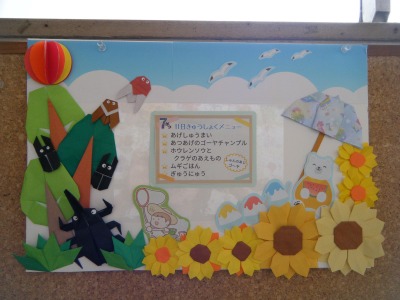 毎日の給食の献立についてお知らせするボードです。なんと!配膳員さんの手作り。6月はアジサイのお花がたくさん咲いていました。7月は、夏空に映えるヒマワリです。思わずつかまえたくなるようなカブトムシもいますね。配膳員さんたちは出勤するとすぐに清掃や消毒に取りかかり、子どもたちが食事を終えて食缶などが戻ってくるまでフル稼働。暑いなか、汗を流しながら活動しています。いつもありがとうございます。