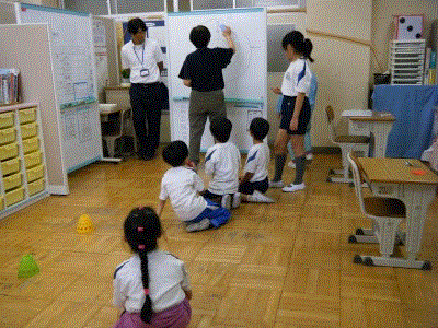 10月2日(木曜)、2学年生活科の時間です。1年生を招待し、一緒に手づくりのおもちゃで遊ぶための計画を立てています。はじめに、お店の名前をグループのみんなで考えました。店名が決まったら、お仕事の役割分担です。得意なことを生かし、やりたい仕事を選ぶなど、積極的に話し合っていました。