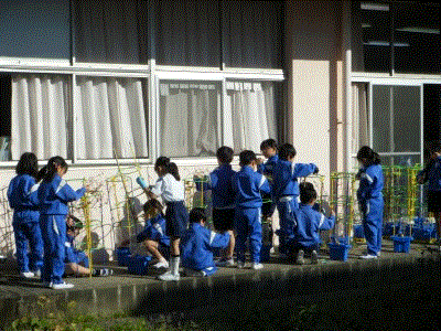 1学年の子どもたちが教室の窓側で作業をしています。生活科の学習で、アサガオのつるを使い、リースを作ります。大きく育ったアサガオのつるを支柱からていねいにはずし、長さを整えてリースの形に巻いていきます。これから落ち葉や木の実を飾り付ける作業も楽しみですね。