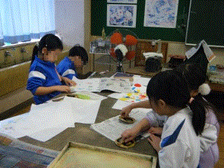 1学年の子どもたちが図画工作でカラーはんがを刷りました。版に色付けしたら、濡らした用紙をのせます。あとはばれんを使って、上から円を描くように少しずつ力を加えていきます。表面をおおっていた新聞紙をめくるときは、ちょっとどきどき。きれいにできました(^▽^)/