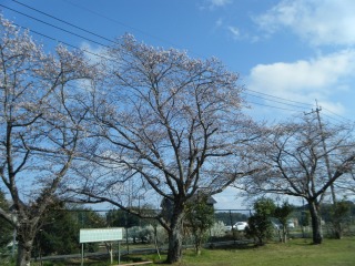 桜の花の優しい色が青空に映えています。道の向こうには桃でしょうか? 白い花が花盛りです。