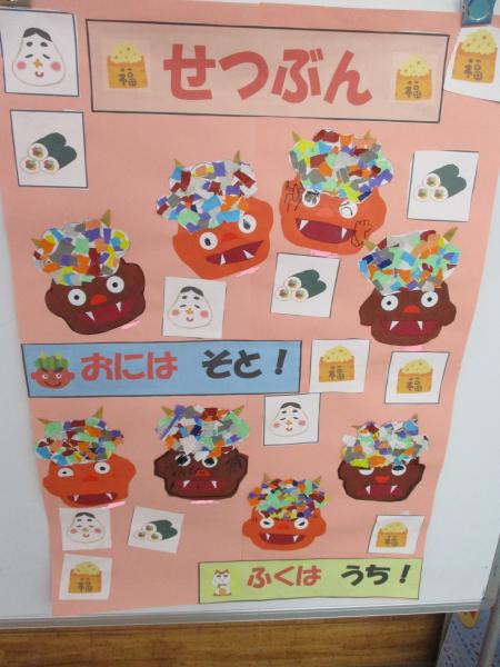 日本語教室では、日本の伝統行事を学ぶということで鬼の掲示をつくってくれ、それを昇降口に飾っております。にじいろ教室でも、一人一人の子どもたちの作品の可愛らしい鬼が掲示されていました。給食で恵方巻とイワシを食べました。日本の伝統行事を食からも学ぶことができました。