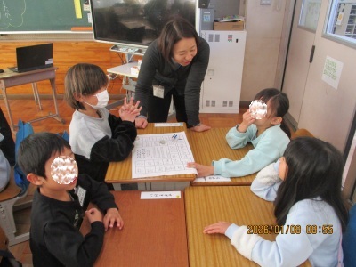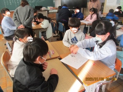 久しぶりに登校した子どもたちの表情は明るく、冬休みの出来事をうれしそうに語る声が校内にあふれました。担任の先生方の工夫で、学級活動で『グループワーク』を取り入れていたクラスが多かったです。子どもたちのニコニコ笑顔が見られました。