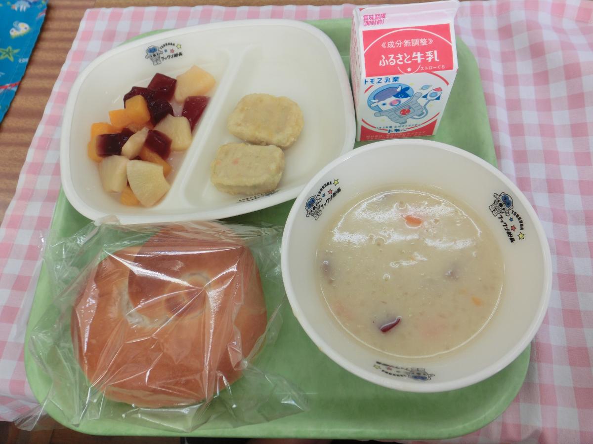 今日の給食は、つくば米粉パン、牛乳、豆腐ナゲット、フルーツあえ、栗とさつま芋のチャウダーでした。チャウダーには、さつま芋のほかに栗も入っており、秋の味覚を美味しくいただきました。おかわりする人も多く、フルーツあえが人気だったようです。また19日は、「つくば市民の日メニュー」です。つくば市産のユメシホウ小麦、白菜など地元の食材がふんだんに使われています。地元の美味しい食材に感謝して、よく味わっていただきましょう。