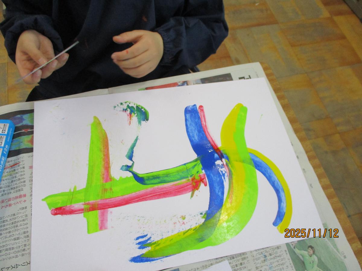 途中で絵具が足りなくなって、線が消えてしまう面白さもあったり、直線だけではなく曲線も描いてみたりと楽しさを味わいながら行っていました。