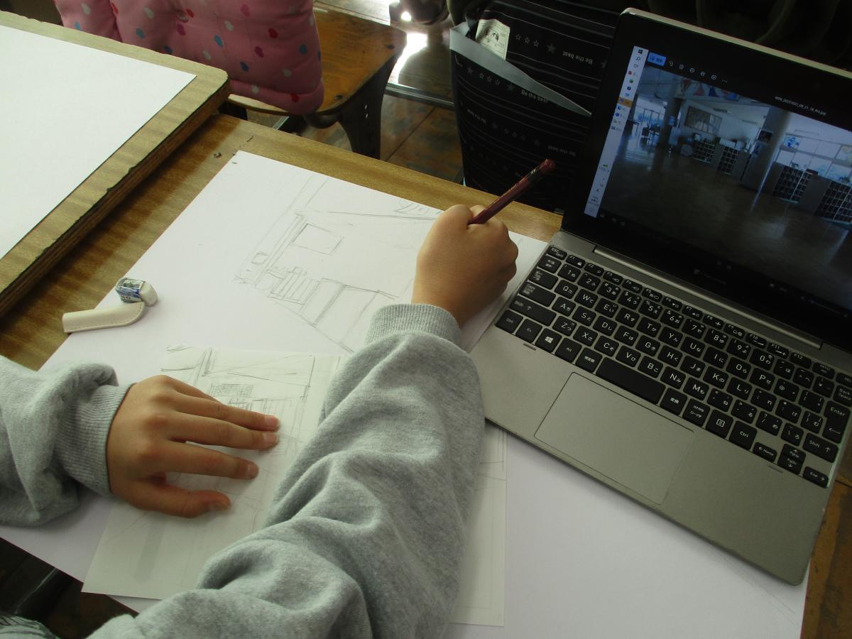 図工では児童たちが「わたしのお気に入りの場所」をテーマに、奥行き感を意識した下書きに取り組んでいます。色を塗る前の段階では、児童たちは線を使って空間を広げ、遠近感を出すことに工夫を凝らしています。