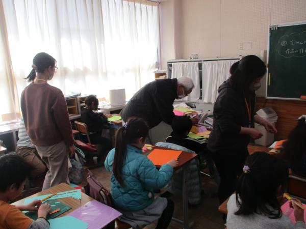 更に、2学年では、図画工作でカッターナイフを使用するため、安全への配慮等見守り支援として、保護者や地域の方5人に来ていただきました。子どもたちは、保護者や地域の方に見守られながら、安心して活動に取り組むことができました。