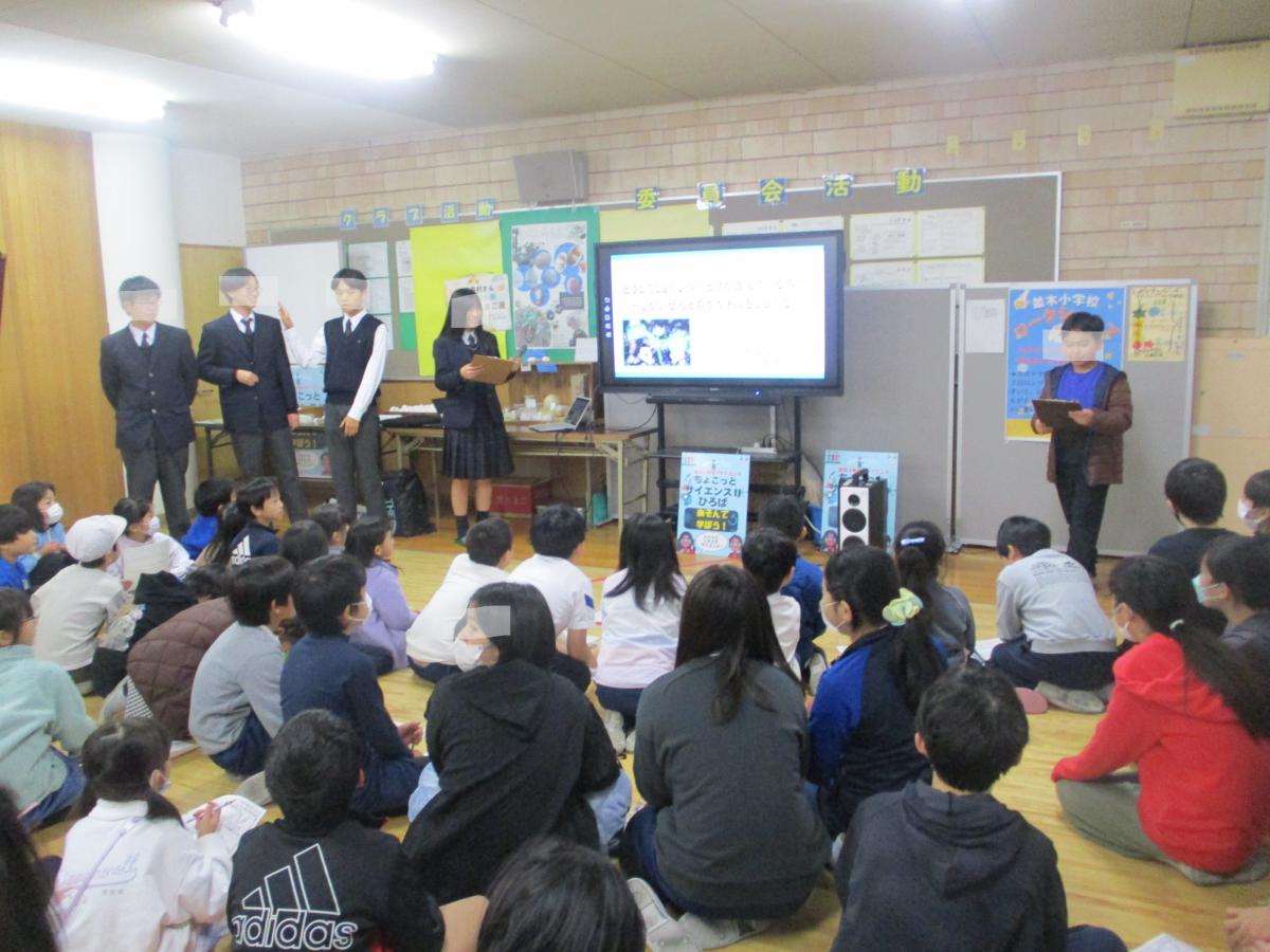 3日のロング昼休み、近くのSSH校の高校生をお招きして、研究発表会を行いました。1年生から6年生まで集まってくれ、いっぱいメモを取りながら、研究のお話をききました。高校生もすべてひらがなでプレゼン資料をつくってくれ、しかも説明も小学生が分かるようにかみ砕いて分かりやすく話してくれました。質問も多く出ました。