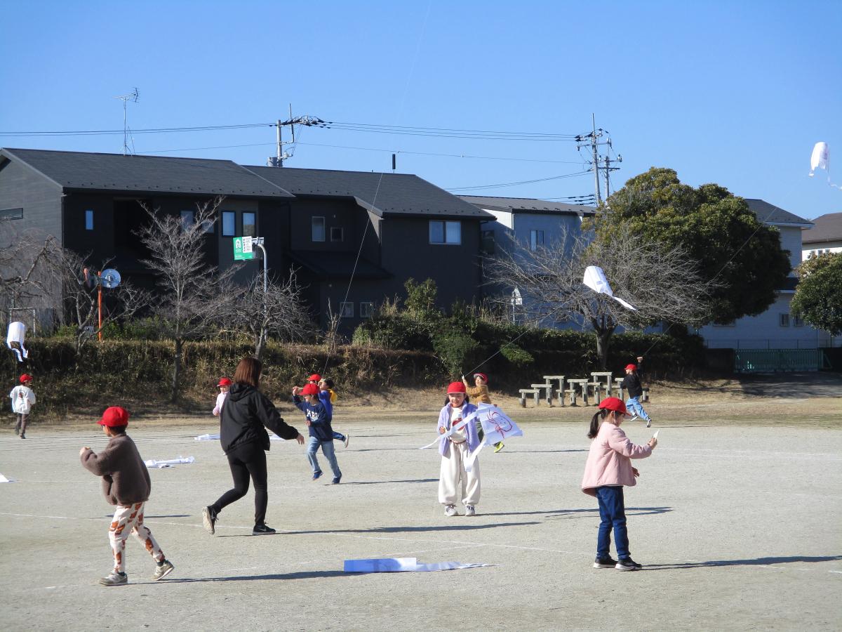青空がどこまでも澄みわたる日、1年生の生活科で「凧揚げ」を行いました。子どもたちは、自分だけの絵が描かれたオリジナルの凧を手に運動場へ集まり、伸び伸びとした色や形に一人一人の思いが表れていました。走り出すと、凧は風をつかんでふわりと浮かび、ぐんぐん空へ上がっていきました。運動場には「上がった!」「見て!」という子どもたちの弾む声が響き、ニコニコ笑顔があふれました。凧揚げが初めての子もいましたが、凧が持ち上がった瞬間に目を輝かせて喜ぶ姿が印象的でした。糸が絡むこともありましたが、「こっち持ってて」「ゆっくりほどこう」と声を掛け合い、助け合いながらまた風に向かって走り出す姿に、1年生のたくましさを感じた時間でした。