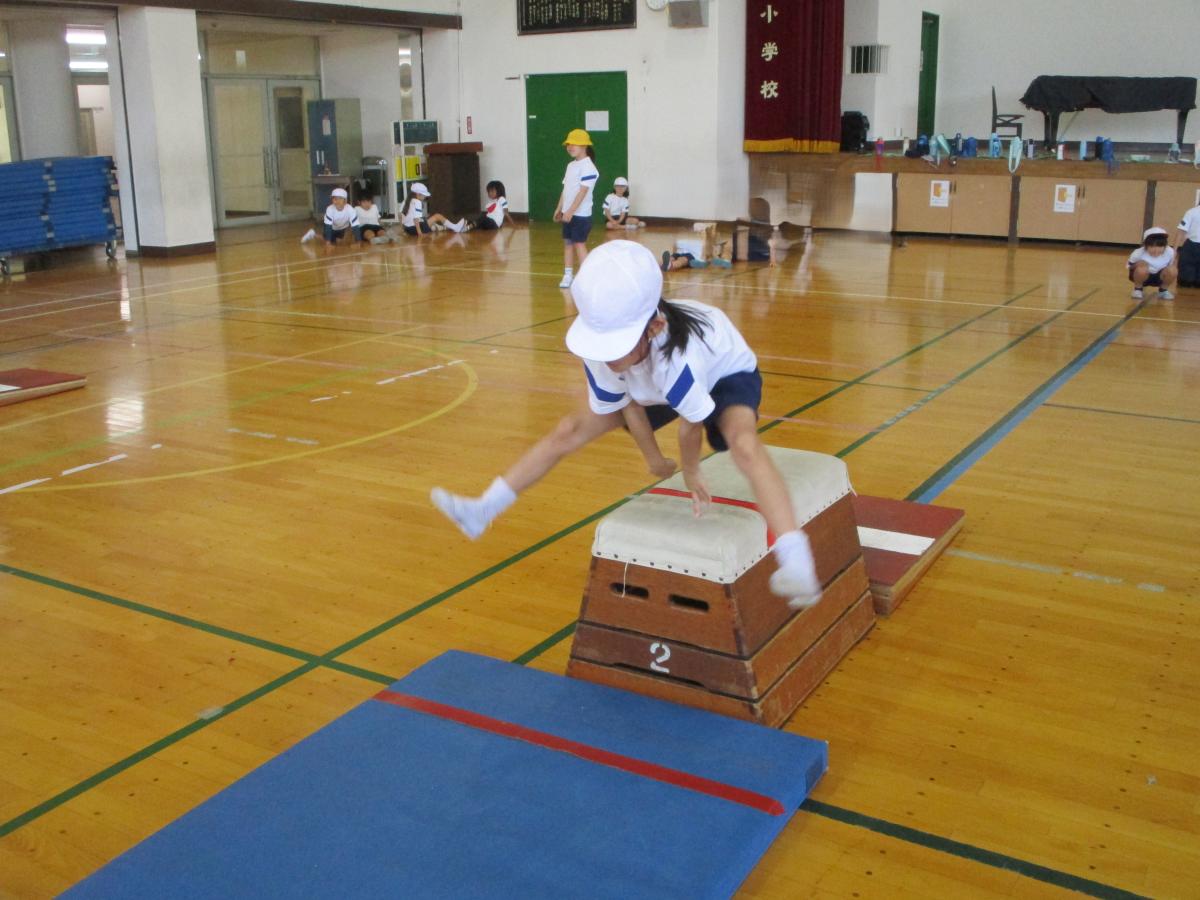 体育の授業では、跳び箱運動が始まりました。 チーターやうさぎになりきって、上手に跳び箱を 飛び越えています。