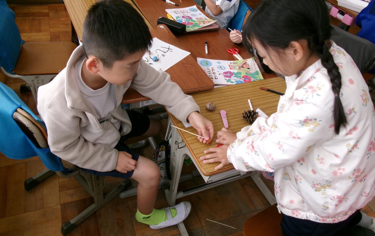 生活科の時間に、秋の木の実や葉っぱ等を使っておもちゃ作りをしています。 作ったおもちゃは幼稚園生を学校に招き、遊んでもらう予定です。 近くに迫った本番に向けて、看板や遊び方ガイドも用意しました。 お兄さん、お姉さんとしての活躍が楽しみです。