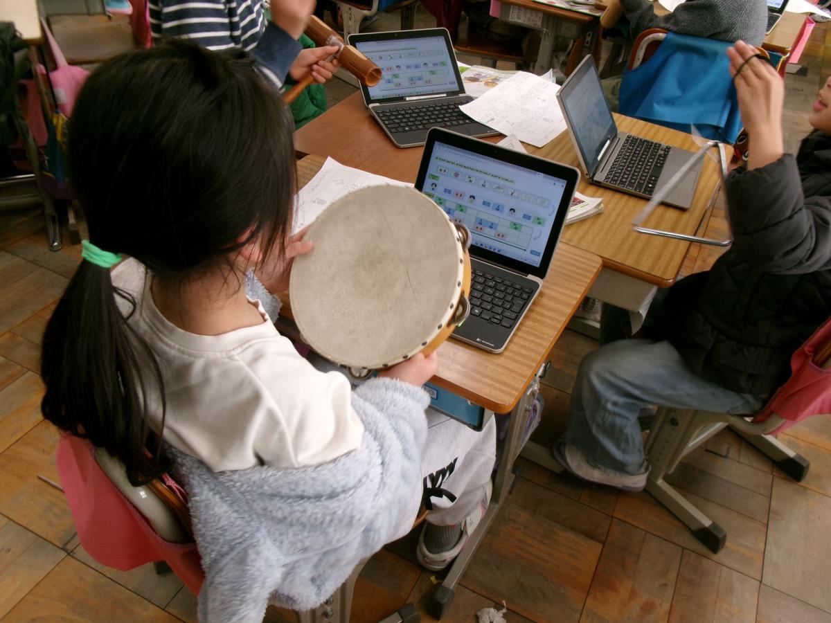 音楽の授業では、絵から音を想像して楽器の鳴らし方を考えました。 考えた音をグループで組み合わせて音楽をつくりました。楽しみながら 取り組むことができました。