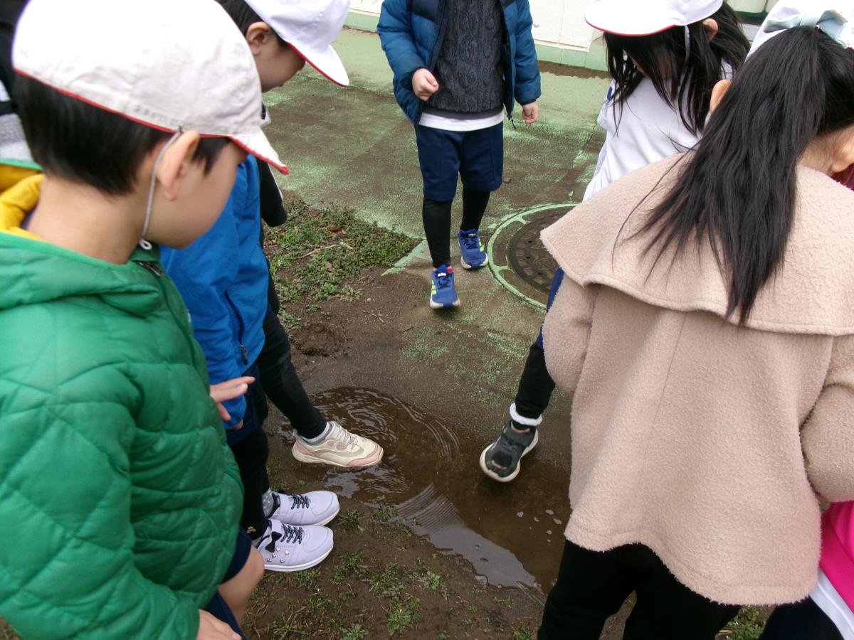 雨上がりの校庭を、五感をつかって観察しました。 晴れの日と違って、土の感触が異なることや、空の色が暗いこと に気付き、ワークシートにまとめていました。