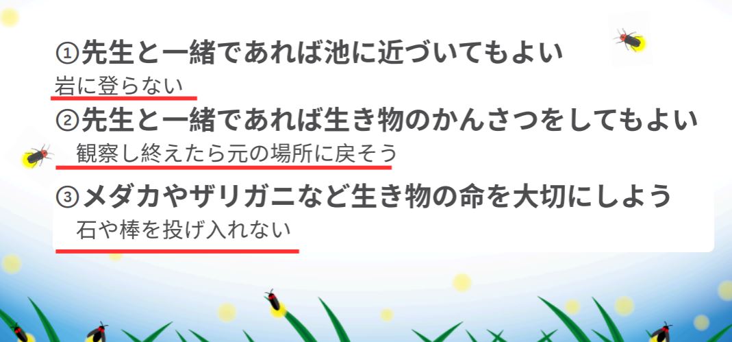 赤い線のところが意識するポイントとして加わりました。ホタル池ルールメイキングは、子供達の手でつくられ、アンケート結果を生かしながら、改善が加わっているものです。ホタル池は本校のシンボルだという思いが、子供達にはあります!