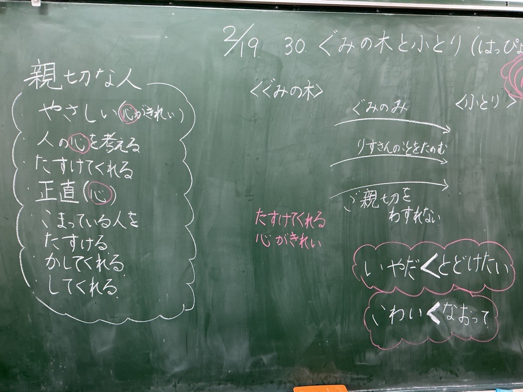 黒板を消そうとしているところに飛び込んでいって、「消さないで~」と言ったら、2年生がニコニコして嬉しそうでした。子供達の出した意見がいっぱいにあふれていました。子供同士、互いの思いや意見を聴き合いながら、子ども達の心に響いていく授業でした。