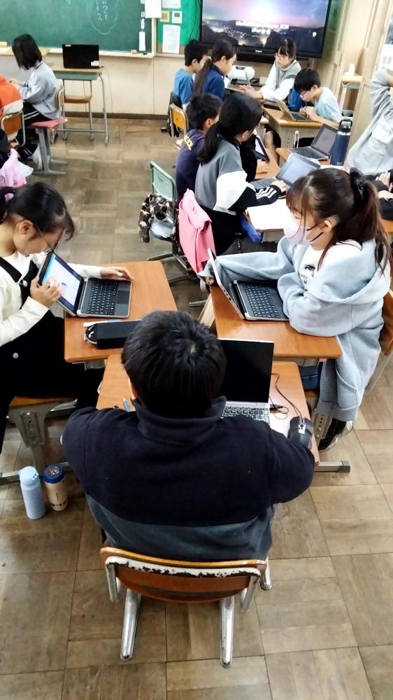 資料からわかることを伝えあったり、自分にできることを聞き合ったりしています。自分の意見をアウトプットしてからのチームや全体でつなぐ時間を自走できるようにした一連の流れをZOOM UP学習と呼んでいます。一人でもチームでも全体でも、自己調整しながら、学びの実り(サクランボ)に向かっています。