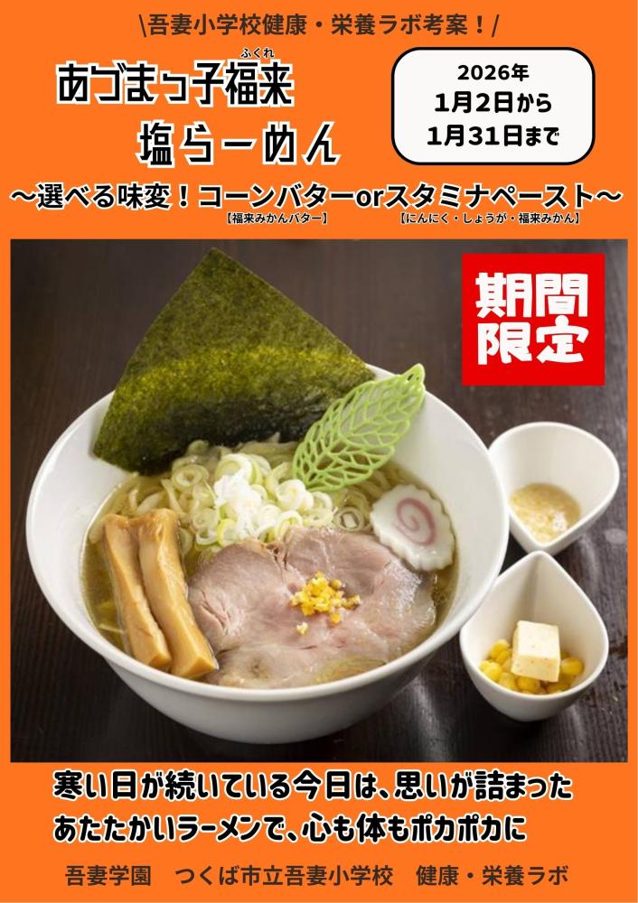 写真は、子供達が作成したポスター案に、活龍さんが色の変更を少し入れてくださったものです。ラーメンは、こんな感じです。子供達もいろいろな班に分かれて探究してきただけはあるラーメンとなっています。どうぞ、ご賞味ください。1月2日から1月31日までです。「あづまっこ ください!!」そんな注文の声がたくさん、活龍で響き渡りますように!健康・栄養ラボのみんな、夢が叶って良かったですね!これからも夢や目標をもって、チャレンジしていく姿勢を大切にしていきましょう。