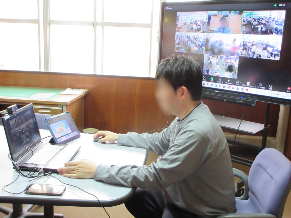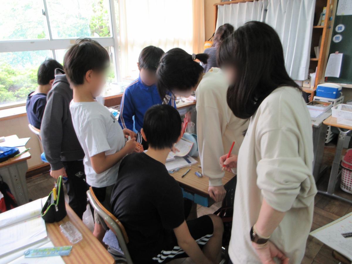 6年生の算数は、図形分野の線対称、点対称の勉強をしていました。コンパスと定規を使いながら、図形をどのように書いていったら良いのか、話し合い活動を中心に行っておりました。互いに教え合い、「わかった」と言う声が聞こえていました。