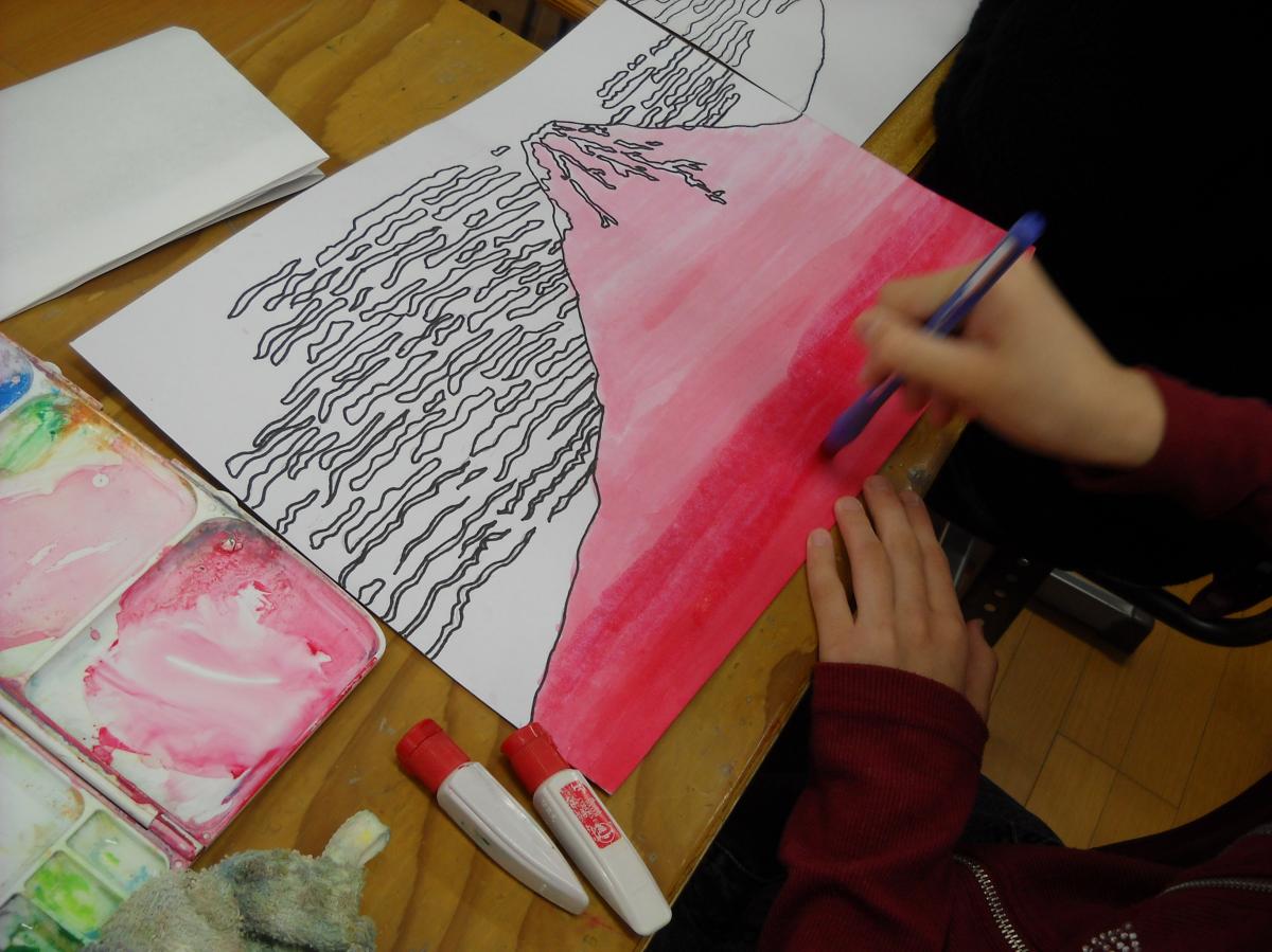 児童は、葛飾北斎の『富嶽三十六景』の2枚の浮世絵から好きな方を選んで鉛筆で下描きをしました。波や雲の表現が非常に細かく、苦戦する様子もありましたが、集中して活動しました。色塗りでは、水や絵の具の量を調節しながら濃淡をつけて塗っています。
