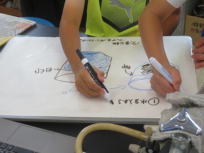 濡れた洗濯物の水は、乾くと一体どこにいってしまうのかを考え、どのように実験をすれば解明できるかをグループで話し合いました!