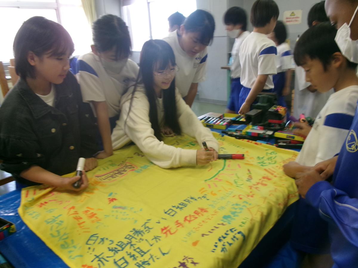 6今年のソーラン節に使用する学級旗を作成しました。運動会に向けた意気込みを一人一言ずつ書き込みました。小学校最後の運動会が、思い出に残るようみんなで力を合わせて進めていきます。
