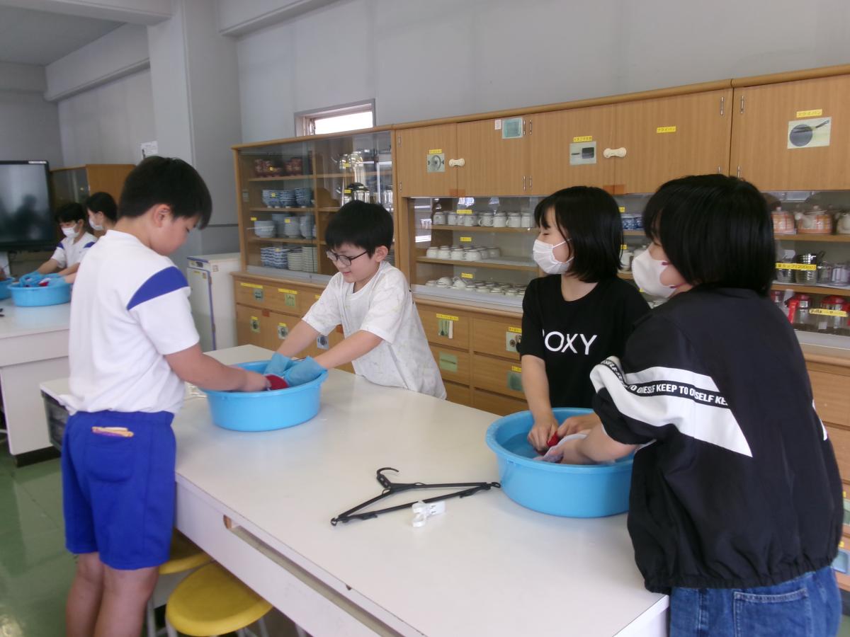 家庭科の学習で、赤白帽子を手洗いしました。特に汚れている部分を確認してから、手洗いに挑みました。全体をもみ洗いした後、汚れがひどい部分はつまみ洗いを行いました。汚れを落とすために丁寧に洗う姿が見られました。ぜひご家庭でも手洗いをお願いしてみてください。ハンガー等の準備、ありがとうございました。