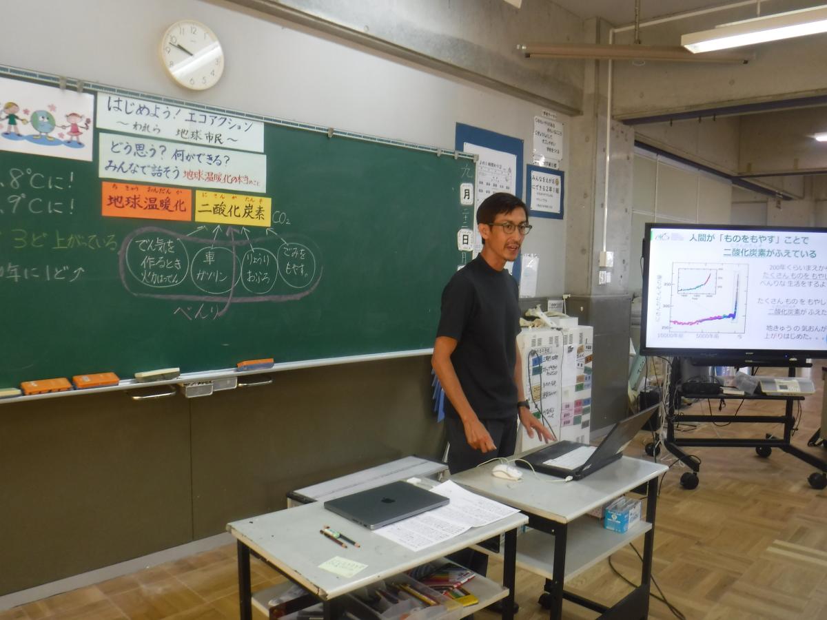 国立環境研究所からゲストティーチャーをお招きして、地球温暖化とエコアクションについてのお話をうかがいました。人間が二酸化炭素を出さずに生活することは難しいけれど、エコアクションによって二酸化炭素を出す量を減らすことができること、二酸化炭素を減らすための新しい研究がされていることなどをわかりやすくお話してくださいました。2年生は夏休み中に毎日エコアクションに取り組みましたが、それを先生にお伝えすると「素晴らしいですね。」とお褒めの言葉をいただきました。「便利な生活は二酸化炭素を出してしまうけれど、少しでもそれを減らす取り組みをしていきたい。」と感想を書いている児童がいました。これからもエコアクションについてさらに調べ、考えを深めていきます。