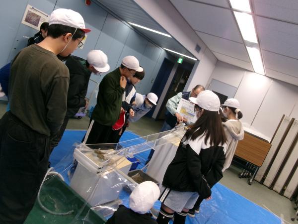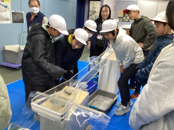 水路実験では、川から湖へどのように土砂が運ばれるかについて、実際に砂を流して観察し、三角州ができるしくみを体験的に学ぶことができました。