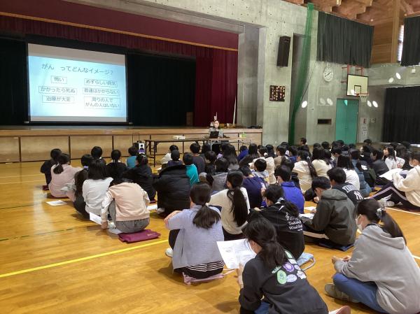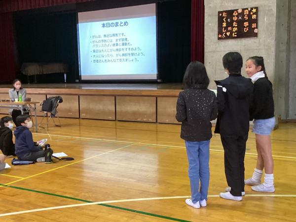 講演の中では、がんが日本の死亡原因の第1位であることが紹介され、子どもたちからは驚きの声が上がりました。がんの診断には、血液検査・画像検査・内視鏡検査・病理検査などさまざまな方法があり、複数の情報を組み合わせて診断が行われていることを学びました。 治療法についても、手術療法・薬物療法・放射線療法に加え、痛みや不安に寄り添う「緩和ケア」があることを知り、がんと向き合うための支えが幅広く用意されていることを理解しました。さらに、がんの予防には、飲酒を控える・喫煙をしない・食生活を整える・体を動かす・適正体重を保つという5つの生活習慣が大切であること、また、がんは無症状のうちに進行することも多いため、早期発見のための「がん検診」が欠かせないことを学びました。身近な大人に検診を勧めることの大切さにも気づいた様子でした。