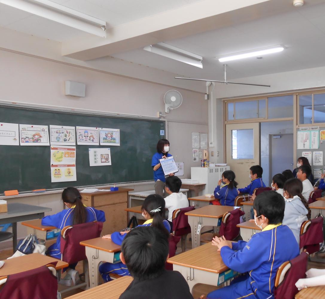 今日は、授業時間5分間を使ってのミニ食育です。もぐもぐタイムやもぐもぐ対面食育の時間の復習です。地産地消についての理解を深めました。