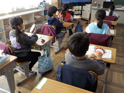1年生は、絵から思い浮かんだ音を組み合わせ、友達と楽器を奏でていました。