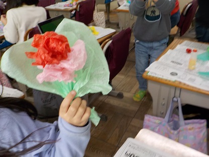 1年生は、ティッシュペーパーでお花やお菓子などを上手に作っていました。