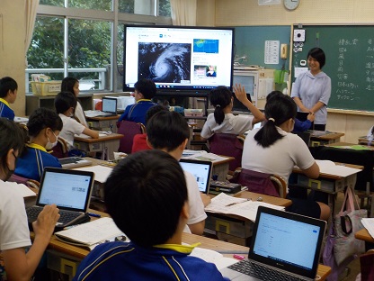 台風の影響で早帰りの日に、5年生は理科の授業で台風について学習していました。強く記憶に残る時間となったことでしょう。