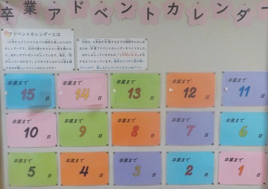 3月になり継嗣式まであと2週間ほどなりました。卒業を控え6年生は、様々な思いで学校生活を送っています。校内のそここには、操業をお祝いするメッセージやアドベントカレンダーを見ることができます。6年生は、お世話になった茎崎二小への恩返しとして校舎の大掃除を行っています。