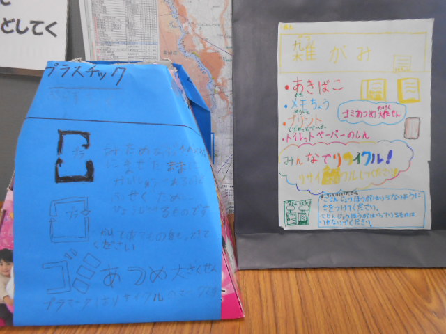 4年生では社会科の授業で、ゴミの分別について学習しています。その学習の一環として、各学級にリサイクルできるものを分別するためのゴミ箱を作り設置しました。今日は設置から1週間経過したので、4年生が各クラスをまわり集まった紙やプラスチックを回収しました。資源を大切にする気持ちを大切にしてほしいと思います。