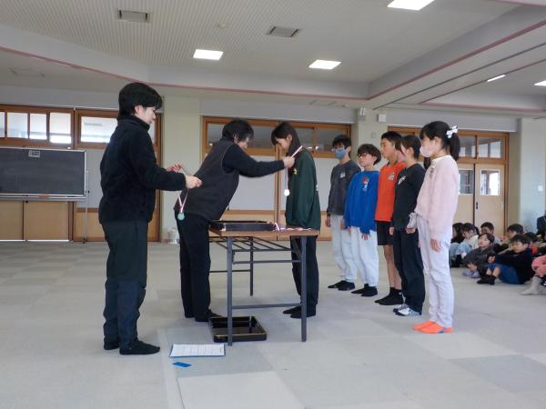 子どもたちは、1秒でも自分の記録を伸ばそうと最後まで一生懸命走り切ることができました。保護者の皆さんの応援も大きな力になりました。ありがとうございました。昼休みには、表彰式が行われ、1位から3位の子どもたちに校長先生からメダルが授与されました。今回は、5年生が学級閉鎖中のため参加できませんでした。12月10日に実施になりますので、5年生頑張ってくださいね。