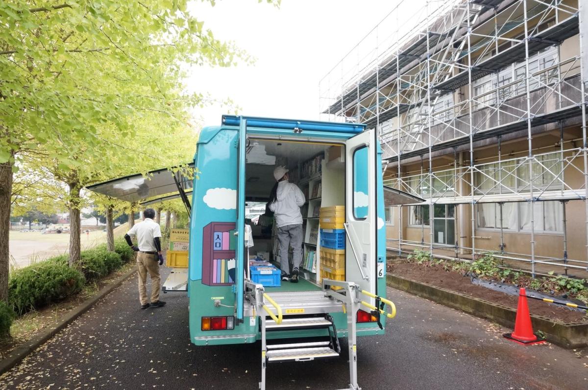月に2回ほど業間休みに自動車図書館が巡回しています。借りた本を返して、また新しい本を探します。読み終わったら、2週間後の自動車図書館の日に返却します。