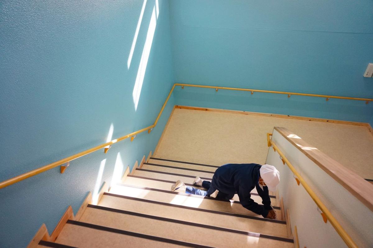新しくなったC棟の階段です。青い色が鮮やかなので「青階段」です。完成したばかりのきれいな状態をキープするために、掃除を丁寧に進めてくれています。
