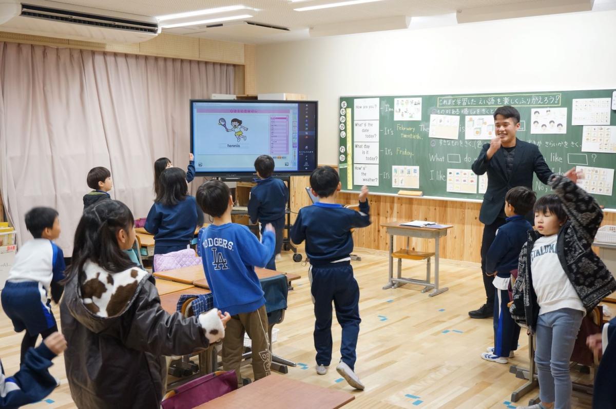 2年生の授業参観は、英語に親しむ内容でした。英単語に合わせた動きをしながら、リズムに合わせて発音するなど、楽しく活動しました。