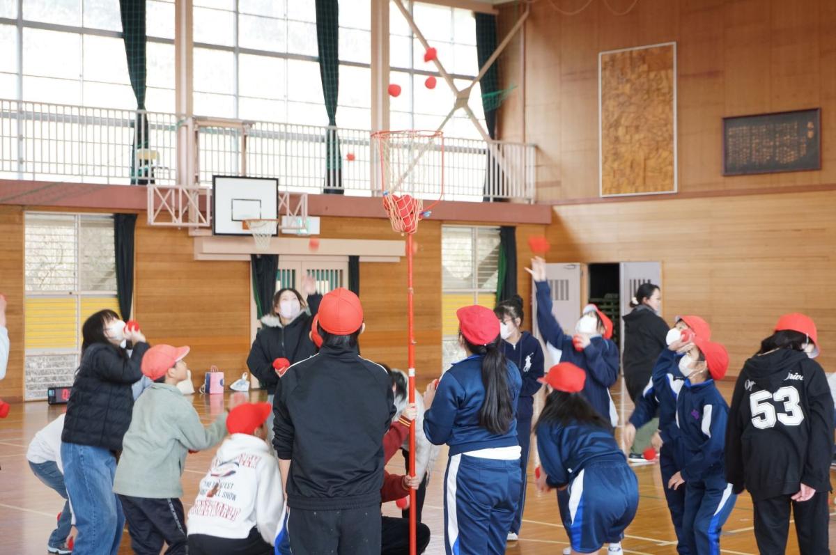 6年生児童と保護者が体育館で親子活動を行いました。玉入れでは、1年生のころにやった時よりも身長が伸び、簡単にたくさん入れることができました。