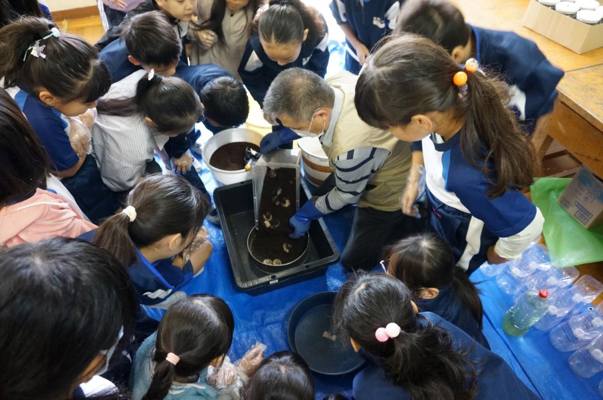 地域のボランティアの方に来ていただいて、カブトムシの幼虫の観察をしました。土の中で育つ幼虫の姿はなかなか見ることができないので、子供たちは興味津々です。