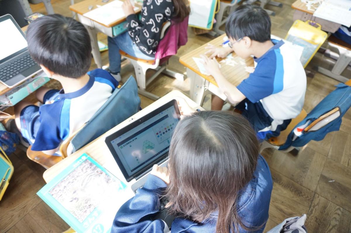 二等辺三角形や正三角形をしきつめるとどんな形ができるか、紙を切って実際に並べたり、タブレットの中で並べたりしながら学習を進めます。「のりを巻いたおむすび」の形もできました。