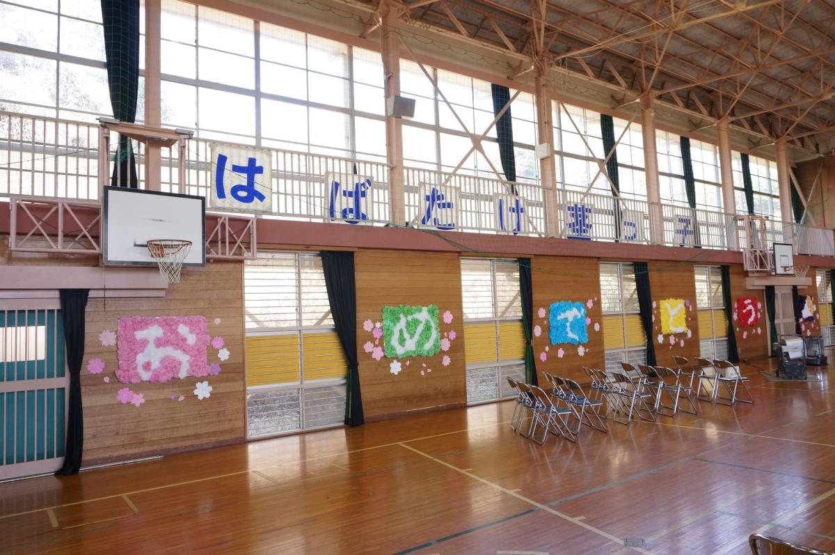体育館の準備も着々と進んでいます。4年生が「お」「め」「で」「と」「う」「花束」を掲示してくれました。6年生のためにみんなで準備しています。