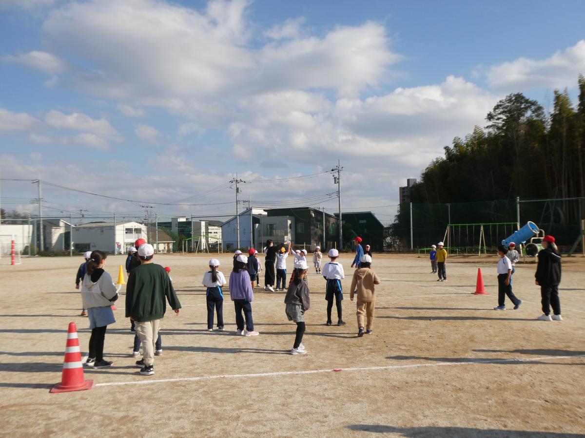 ロング昼休みに縦割り班活動を行いました。高学年が低学年を迎えに行き、声をかけ合いながら活動場所へ向かいました。活動では、ドッジボールやだるまさんが転んだ、氷おに、フルーツバスケットなど、班ごとに工夫した遊びを楽しみました。学年をこえて一緒に体を動かし、笑顔や歓声があふれる時間となりました。活動後は片付けとあいさつを行い、落ち着いて教室へ戻ることができました。協力する楽しさを感じるひとときとなりました。