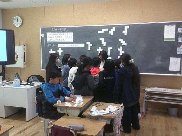 6つの正方形の紙をテープでつなげながら、どうすれば立体になるのかを、グループで協力して考えました。